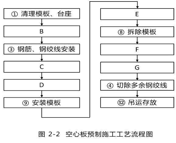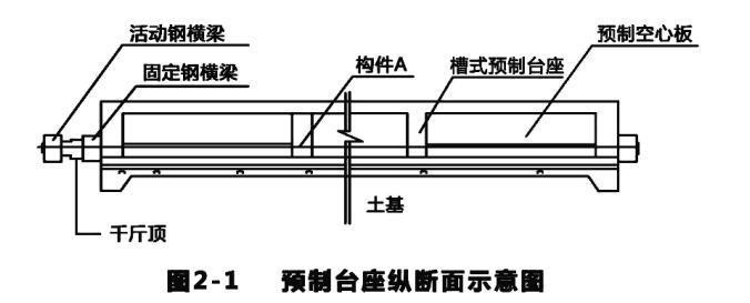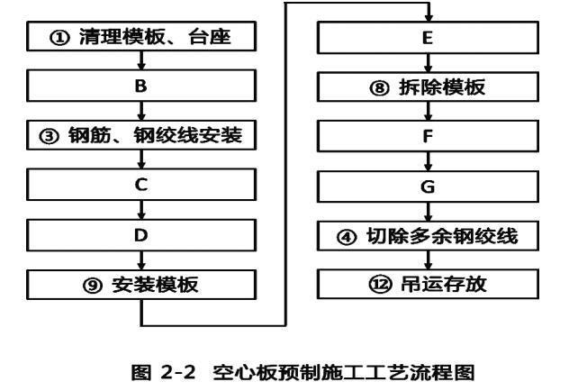 问题 某公司承建一座城市桥梁工程。该桥上部结构为 16×20m 预应力混凝土空心板,每跨布置空心板 30 片。进场后,项目部编制了实施性总体施工组织设计,内容包括: (1)根据现场条件和设计图纸要求,建设空心板预制场。预制台座采用槽式长线台座,横向连续设置 8 条预制台座,每条台座 1 次可预制空心板 4 片,预制台座构造如图 2-1 所示。 (2)将空心板的预制工作分解成 ① 清理模板、台座,② 涂刷隔离剂,③ 钢筋、钢绞线安装,④ 切除多余钢绞线,⑤隔离套管封堵,⑥ 整体放张,⑦ 整体张拉,⑧ 拆除模板,⑨ 安装模板,⑩ 浇筑混凝土,? 养护, ? 吊运存放等 12 道施工工序,并确定了施工工艺流程如图 2-2 所示。(注:① ~?为各道施工工序代号) (3)计划每条预制台座的生产(周转)效率平均为 10 天,即考虑各条台座在正常流水作业节拍的情况下,每 10 天每条预制台座均可生产 4 片空心板。 (4)依据总体进度计划空心板预制 80 天后,开始进行吊装作业,吊装进度为平均每天 吊装 8 片空心板。 1. 根据图 2-1 预制台座的结构型式,指出该空心板的预应力体系属于哪种型式?写出构件 A 的名称。 2. 写出图 2-2 中空心板施工工艺流程框图中施工工序 B、 C、 D、 E、 F、 G 的名称。(选用背景资料给出的施工工序①~?的代号或名称作答) 3. 列式计算完成空心板预制所需天数。 4. 空心板预制进度能否满足吊装进度的需要?说明原因。