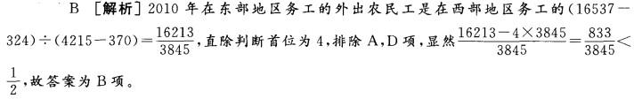 问题 根据以下资料, 2011年全国农民工总量达到25278万人,比上年增加1055万人。其中,外出农民工15863万人,增加528万人。住户中外出农民工12584万人,比上年增加320万人;举家外出 农民工3279万人,增加208万人。本地农民工9415万人,增加527万人。 从输出地看,东部地区农民工10790万人,比上年增加323万人,增长3. 1%,东部地区农 民工占农民工总量的42. 7%;中部地区农民工7942万人,比上年增加323万人,增长4.2%, 中部地区农民工占农民工总量的31. 4%;西部地区农民工6546万人,比上年增加409万人, 增长6. 7%,西部地区农民工占农民工总量的25. 9%。 从农民工的就业地区来看,2011年在东部地区务工的农民工16537万人,比上年增加324 万人,增长2.0%,占农民工总量的65.4%,比上年降低1.5个百分点;在中部地区务工的农民 工4438万人,比上年增加334万人,增长8. 1%,占农民工总量的17. 6%,比上年提高0. 7个 百分点;在西部地区务工的农民工4215万人,比上年增加370万人,增长9.6%,占农民工总 量的16. 7%,比上年提高0.8个百分点。 分性别看,男性农民工占65.9%,女性占34. 1%;分年龄段看,农民工以青壮年为主,在外 出农民工中,16?20岁占6.3%,21?30岁占32. 7% ,31?40岁占22. 7%,41?50岁占 24.0%,50岁以上的农民工占14.3%。调查资料显示,40岁以上农民工所占比重逐年上升, 由2008年的30. 0%上升到2011年的38. 3%,三年中农民工平均年龄也由34岁上升到36 岁。从婚姻状况看,已婚的外出农民工占58.2%。 在农民工中,文盲占1.5%,小学文化程度占14.4%,初中文化程度占61.1%,高中文化 程度占13.2%,中专及以上文化程度占9.8%。外出农民工和年轻农民工中初中及以上文化 程度分别占88. 4%和93. 8%。外出农民工的受教育水平明显高于本地农民工,青年农民工的 受教育水平最高,也是最具潜力的农民工群体。 2011年,外出农民工月均收人2049元,增长21.2%。分地区看,在东部地区务工的农民 工月均收人2053元,比上年增加357元,增长21.0%;在中部地区务工的农民工月均收入 2006元,比上年增加374元,增长22. 9% ;在西部地区务工的农民工月均收入1990元,比上年 增加347元,增长21. 1%。 从农民工的就业地区来看,2010年在东部地区务工的外出农民工约是在西部地区务工的 ( )。 A. 3. 8 倍 B. 4. 2 倍 C. 4. 6 倍 D. 5. 0 倍