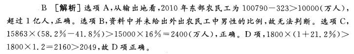 问题 根据以下资料, 2011年全国农民工总量达到25278万人,比上年增加1055万人。其中,外出农民工15863万人,增加528万人。住户中外出农民工12584万人,比上年增加320万人;举家外出 农民工3279万人,增加208万人。本地农民工9415万人,增加527万人。 从输出地看,东部地区农民工10790万人,比上年增加323万人,增长3. 1%,东部地区农 民工占农民工总量的42. 7%;中部地区农民工7942万人,比上年增加323万人,增长4.2%, 中部地区农民工占农民工总量的31. 4%;西部地区农民工6546万人,比上年增加409万人, 增长6. 7%,西部地区农民工占农民工总量的25. 9%。 从农民工的就业地区来看,2011年在东部地区务工的农民工16537万人,比上年增加324 万人,增长2.0%,占农民工总量的65.4%,比上年降低1.5个百分点;在中部地区务工的农民 工4438万人,比上年增加334万人,增长8. 1%,占农民工总量的17. 6%,比上年提高0. 7个 百分点;在西部地区务工的农民工4215万人,比上年增加370万人,增长9.6%,占农民工总 量的16. 7%,比上年提高0.8个百分点。 分性别看,男性农民工占65.9%,女性占34. 1%;分年龄段看,农民工以青壮年为主,在外 出农民工中,16?20岁占6.3%,21?30岁占32. 7% ,31?40岁占22. 7%,41?50岁占 24.0%,50岁以上的农民工占14.3%。调查资料显示,40岁以上农民工所占比重逐年上升, 由2008年的30. 0%上升到2011年的38. 3%,三年中农民工平均年龄也由34岁上升到36 岁。从婚姻状况看,已婚的外出农民工占58.2%。 在农民工中,文盲占1.5%,小学文化程度占14.4%,初中文化程度占61.1%,高中文化 程度占13.2%,中专及以上文化程度占9.8%。外出农民工和年轻农民工中初中及以上文化 程度分别占88. 4%和93. 8%。外出农民工的受教育水平明显高于本地农民工,青年农民工的 受教育水平最高,也是最具潜力的农民工群体。 2011年,外出农民工月均收人2049元,增长21.2%。分地区看,在东部地区务工的农民 工月均收人2053元,比上年增加357元,增长21.0%;在中部地区务工的农民工月均收入 2006元,比上年增加374元,增长22. 9% ;在西部地区务工的农民工月均收入1990元,比上年 增加347元,增长21. 1%。 以下说法中,不正确的一项是( )。 A.从输出地看,2010年东部地区农民工超过1亿人 B. 2011年,全国男性外出农民工超过9千万人 C. 2011年,全国外出农民工中,已婚的与未婚的人数之差大于2千万人 D. 2010年,外出农民工的月平均工资不到1800元