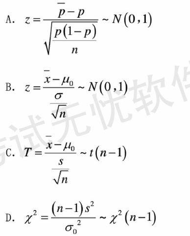 解析 题中属于大样本条件下总体成数的假设检验,因此采用的检验统计量为: B项是总体方差已知,关于总体均值的检验;C项是总体方差未知,关于总体均值的检验;D项是总体均值未知,关于总体均值的检验。