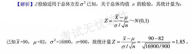 问题 某居民区共有30000户,2013年初用简单随机抽样抽选了900户进行调查。根据样本数据计算得2012年平均每户年用水量 若已知该小区2011年平均每户年用水量μ=82立方米,σ2=16900,请对该小区居民2012年与2011年的平均用水量行检验,检验计算出的统计量Z值是( )。