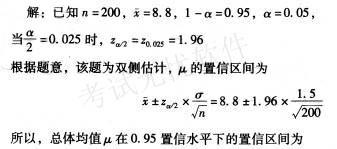问题 某种零件的长度服从正态分布。已知总体标准差σ=1.5,从总体中抽取200个零件组成样本,测得它们的平均长度为8.8厘米。试估计在95%置信水平下,全部零件平均长度的置信区间。