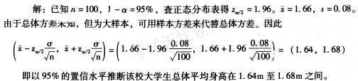 问题 对某大学在校15000名学生的身高进行调查,从中随机抽取了100人进行抽样调查,测得的样本平均身高为1.66m,标准差为0.08m,总体平均身高未知,现以95%的置信水平对总体平均身高进行估计。