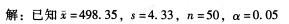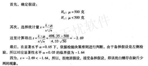 问题 商场里的白糖,一般包装都是500克一袋。有一位顾客买了一袋白糖,秤重量发现只有490克。于是他找到质量监督部门进行投诉。质量监督部门找到相同品牌相同包装的白糖50袋,进行秤重记录。计算这50包白糖的平均重量为498.35克,标准差为4.33克。请问:在置信水平α=0.05下,调查结果是否说明该品牌的白糖每袋重量不足500克,存在缺斤少两的现象?