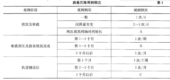 问题 某段新建高速铁路路基工程,主要施工内容有路堑土方开挖和路堤填筑。路堤段长度300m,最大填筑高度为8m,所经地段大部分为水田,设计判定为软弱地基;路堤基床底层设计采用改良土填筑,基床表层设计采用级配碎石填筑,路堤填筑完成后需要堆载预压。依据《高速铁路路基工程施工技术规程》规定,路基沉降观测频次见表1。 施工中发生以下事件: 事件1:在进行路堑开挖前,施工队开挖了堑顶临时截水沟,并对沟底进行了夯实,以防止渗漏;当路堑开挖至基底底层时,发现有坑穴,局部软弱,施工队为了不影响现场施工,直接挖开坑穴,对其进行了分层夯填处理。 事件2:路堤填筑施工前,项目经理部编制的路基沉降观测方案为:观测内容包括地基沉降和侧向水平位移;沉降观测采用三等水准测量;观测断面设置的间距为150m。 事件3:在填筑路堤基床底层改良土施工前,项目经理部给施工队技术交底的内容为:基床底层进行分层填筑,分层的最大压实厚度不大于35cm,最小压实厚度不小于10cm;依据沉降观测数据控制填筑速率,边桩侧向水平位移量和路堤中心地面沉降量每天均不得大于10mm,沉降值一旦超过该指标时应放慢填筑速度。 【问题】 1.分别给出表1中A、B和C所代表的观测频次。 2.针对事件1中做法的不妥之处,给出正确做法。 3.针对事件2中路基观测方案的不妥之处,给出正确做法。 4.针对事件3中技术交底内容的不妥之处,给出正确做法。