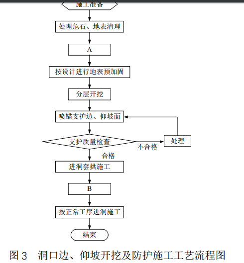 问题 某施工单位承建某铁路客运专线双线隧道。隧道长度为2600m,起止里程为DK38+000~DK40+600。进、出口段浅埋,围岩为风化泥灰岩,岩体破碎,节理发育,裂隙水丰富,级别为V级;洞身DK39+100~DK39+500段围岩级别为II级,初期支护采用喷射混凝土支护。施工过程中,发生以下事件。 事件一:项目经理部工程部编制了隧道进口段施工方案,拟采用全断面开挖方法。经项目总工程师审查后,认为开挖方法不正确。 事件二:对出口段编制了《洞口边、仰坡开挖及防护施工工艺流程图》,如图3所示。 事件三:II级围岩段喷射混凝土作业时,水泥使用矿渣水泥,混凝土采用强制式搅拌机搅拌,其搅拌时间为1min,喷射采用干喷工艺,分段分层喷射作业,后一层喷射在前一层混凝土终凝后进行,并且一次最大喷射厚度拱部为10cm、边墙为15cm,为了节约成本,部分使用了回弹料。 【问题】 1.说明事件一中进口段采用全断面开挖施工方法不正确的理由。 2.指出图3中A和B所代表的施工工序名称。 3.针对事件三中的不妥之处,给出正确的做法。 4.根据背景资料,该洞口段开挖安全专项施工方案中应包括哪些安全技术措施?