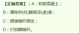 问题 (四) 背景资料 某双线铁路隧道 DK38+100~DK38+400 段。地质以中风化粉砂岩为主,设计围岩级别为Ⅴ级,该段开挖设计为三台阶预留核心土法,初期支护采用钢架锚喷支护,钢架设计间距为 80cm。项目经理部采用台阶法开挖,钢架施工流程如图 4-1 所示。某日,距掌子面 30m 处初期支护发生扭曲变形,拱部初期支护混凝土出现开裂、掉块;现场施工情况如图 4-2 和图 4-3 所示。 问题 1. 根据背景资料,对隧道洞身开挖作业进行主要危险源辨识,指出其内容。 2. 指出图 4-1 中 A、B、C 和 D 代表的施工工序。 3. 根据图 4-2 和图 4-3 开挖作业安排,从施工安全角度,指出该开挖作业可能导致的直接后果,并说明理由。 4. 针对图 4-2 的施工步距,从施工安全角度,指出其错误之处,并说明原因。 5. 为防止初期支护变形加剧,应对初期支护采取哪些主要补强措施?