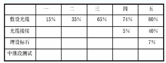 背景资料 某光缆线路工程进度计划见下表: 单位:周 说明:①各项工作每周完成量相等。 ②光缆接续在敷设光缆完成60%工作量时开始。 ③埋设标...