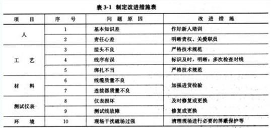 解析 1.从最末一层的原因中选取和识别(一般为3-5个)对结果有最大影响的原因,并对它们做进一步的研究、论证,然后采取措施和控制等,见图3-1所示。 2.根据因果分析图中的质量因素制定改进措施见表3-1所示。