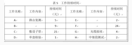 背景资料 某大型施工单位承接了某运营商的一项管道光缆线路工程,工作内容和持续时间见表5。 项目部按照图5所示的施工工序关系编制了施工进度计划,但工...