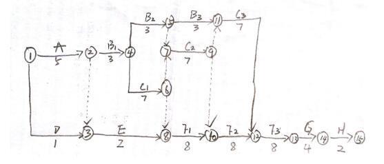 解析 1.B 工作:清刷管孔 E 工作:光缆配盘 F 工作:敷设光缆 2.优化前的关键线路为:路由复测-清刷管孔-敷设子管-敷设光缆-光缆接续-中继段测试 3. 4.优化后的关键工作为:A.B1.C1.F1.F2.F3.G.H 优化后的工期为:5+3+7+8+8+8+4+2 = 45 天 5.事件一:E 工作是非关键工作,总时差为8天,延误9天超过其总时差9-8=1天,故使总工期延误1天 事件二:F1 工作是关键工作,停工 2 天,影响 F1 工作停工2天,造成总工期延迟 2 天 6.旁站.巡视和平行检验