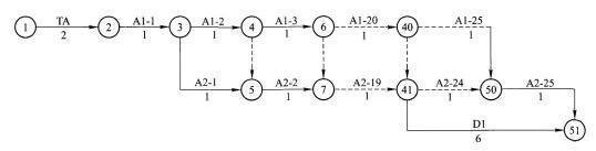 解析 (1)本工程各项主要工作的排列顺序为:路由复测——挖沟及处理障碍—放缆一回填及标石埋设——接续(光缆接续、成端制作)—中继段测试——整理(汇总)竣工资料。 (2)对于光缆接头及成端制作,按照不同的施工条件、不同的监测方式,可以将接头制作放在前边,也可以将成端制作放在前边。如果ODF架已经安装完毕、局端光缆已经敷设完成时,可先进行成端制作,然后采用单向法对光缆接头进行监测,此时也可以采用双向法对每个光缆接头进行双向监测。当局端光缆不具备施工条件时,只能先进行光缆接头制作,采用双向监测法监测,最后待具备条件时再完成光缆成端制作工作。 (3)项目部首先将此工程分解为三个中继段,然后将每个中继段的工作进一步分解为路由复测、挖沟及处理障碍、放缆回填及标石埋设、光缆接续及全程测试等项工作。 (4)本工程项目部采用流水作业法合适。采用流水作业法的条件是: ①可以把工程的施工分为若干个过程,每个过程分别由固定的作业队负责完成。 ②可以把工程划分为劳动量大致相等的施工段(也称流水段)。 ③各作业段施工持续的时间相近。 ④各作业队按一定的施工工艺要求配备必要的施工资源,依次性地、连续性地由一个施工段转移到另一个施工段,反复地完成同类工作。 ⑤各作业队完成各施工过程的时间可以适当地搭接起来。 (5)在考虑工序搭接的情况下,要求工期最短(时问按整天考虑)、费用最低,绘制的本工程包含路由复测、挖沟及障碍处理、放缆回填及埋设标石、接续及测试的横道图如下。 (6)如果时间按整天考虑,各中继段的作业组正常施工,在考虑流水作业的情况下,A组的工作可以分解为A1-n(A中继段第一作业组第n天的工作)、A2-n(A中继段第二作业组第n天的工作);当A中继段光缆接续、测试需要的时间D1=6天时,A中继段的双代号网络图如下图。 (7)影响本工程进度的可能因素有外部因素和施工单位的内部影响因素。 ①外部因素有:建设单位的配套机房未建好;材料不能按时到货或到货材料有质量问题;施工单位得不到急需的建设资金;建设单位不能及时提供满足要求的施工图设计;政府的重要会议、大型活动、重要节假日禁止施工;交通不便;当地居民阻止施工等。 ②施工单位的内部影响因素有:对突发情况应对不力;为工程配备的熔接设备和仪表不能满足工程的需要;投入的技术力量不能满足工程需要,如光缆接续人员技术不熟,生手太多;施工过程中,因质量问题造成大量返工;施工现场资金紧缺;施工过程中发生安全事故等。 (8)项目部在进行进度控制时,应按照事前、事中、事后的过程方法工作。项目部应在施工准备阶段编制出工程项目进度计划。在施工过程中应将此计划落实下去,要求现场作业班组按照此计划安排施工;施工过程中,项目部还应对工程进度实行动态控制,检查实际进度与计划进度的偏差,发现偏差应及时分析原因,采取相应的纠正措施,保证工程项目在合同规定的工期内完成。 (9)如果施工进度延误,项目部应通过分析延误进度的原因,找出调整进度的方法。在调整进度时,可考虑下列方法,调整进度偏差时还应考虑调整成本: ①及时消除影响进度的因素; ②增加施工人员或延长施工人员的劳动时间; ③增加施工机具、设备、仪表或倒班作业; ④改变某些工作间的逻辑关系; ⑤缩短某些工作的持续时间。