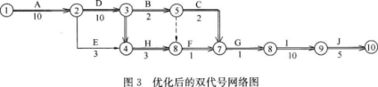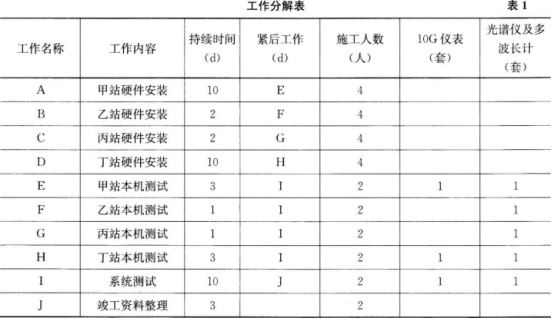 解析 1.人工及人员直接开支成本=(4×1O+2×4+2×4+10×4+3×2+1×2+1×2+3×2+10×2+5×2)×1000=142000元 仪表成本=(3+3+10)×5000+(3+1+1+3+10)×500=89000元 管理成本=42×1500=63000元 总计划成本=142000+89000+63000=294000元 2.优化后的双代号网络图,如图3所示。 本工程优化后的计算工期为40d。 3.事件1可以向建设单位提出索赔要求,因为是设计单位的原因。 事件2可以向建设单位提出索赔要求,因为是设备厂商的原因。 事件3不可以向建设单位提出索赔要求,因为是施工单位自身的原因。 本工程可以索赔的工期为:1+5=6d。 4.系统测试项目包括:(1)系统误码测试;(2)系统输出抖动测试;(3)信噪比测试;(4)公务功能测试;(5)网管功能测试。