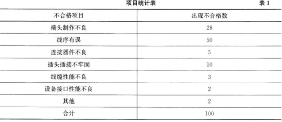 问题 某项目部承担了一项程控交换设备安装工程,采用包工不包料方式承包,约定工期40d。开工前,项目部指派技术员进行现场勘查,明确了施工用电和空调设施、现场的特殊要求等情况,同时根据施工图设计对机房地板、需安装设备位置及数量等进行了复核。工程硬件安装完成后进行了用户线缆测试,发现了很多质量问题,用户线缆测试不合格。 项目统计表,见表1。 【问题】 1.列出施工图设计现场复核还应包括的主要内容。 2.做出用户线缆测试不合格项排列表。 3.做出用户线缆测试不合格项排列图。 4.分析用户线缆不合格的主要原因并提出改进措施。