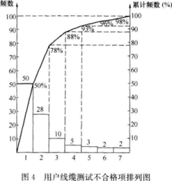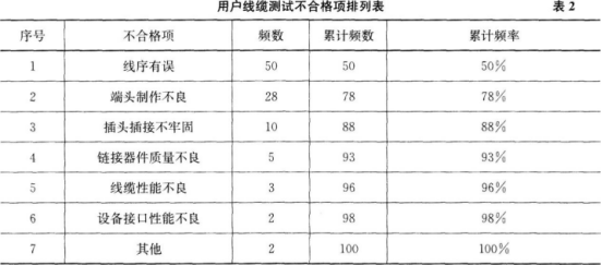 解析 1.现场复核还应包括的内容:(1)线缆路由、设计长度是否可行;(2)电源电压、熔断器容量是否满足设计要求;(3)保护接地的位置是否有余。 2.用户线缆测试不合格项排列表,见表2。 3.用户线缆测试不合格项排列图,如图4所示。 4.累计频率0~80%为主要原因。即线序有误和端头制作不良。改进措施:做好培训,按规范操作,及时查对。