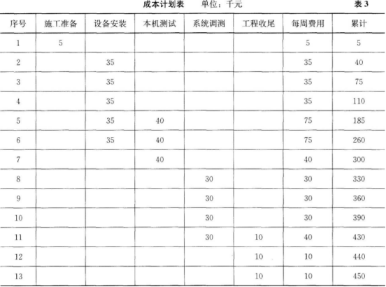 解析 1.按周编制的成本计划,见表3。 2.合理。A施工单位与建设单位签订的是传输设备安装工程的施工合同,第(2)项变更属于线路工程,施工单位可以以不具备线路施工资质或不具备线路施工条件予以拒绝。 3.由于是建设单位作出的变更造成了施工单位的进度拖后和费用增加,所以施工单位可以就第(1)项、第(2)项造成的损失进行索赔。可索赔的工期为3周;可索赔的费用为第(1)项变更增加的费用和第(2)项变更导致的停工损失费。 4.因为工程总额小于500万,建设单位应该在施工单位提交竣工资料的20d内审定完毕,即在8月10日之前完成。 本工程价款结算说明包含:工程结算总价款,工程款结算的依据,因工程变更等使工程价款增减的原因。 5.本工程建设单位保修金的比例为5%;保修日期为正式交付使用一年后截止,即2016年11月1日。 6.本工程环境因素:铁件刷漆时被随意倾倒的剩余油漆;楼板、墙壁、铁件钻孔时的粉尘、噪声;切割机的噪声;设备开箱时,随意丢弃的包装物等垃圾;随意丢弃的废电池;光(电)缆接续时下脚料、随意丢弃的废弃物,微波、移动工程的电磁辐射;施工材料、机具、仪表随意摆放;未换鞋进入机房等。