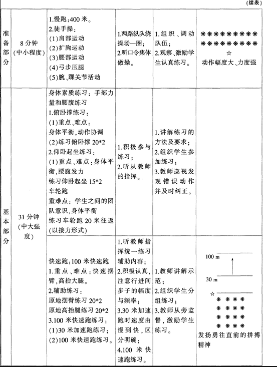 问题 阅读材料.根据所提供的条件进行教学设计。 水平四,初中二年级(2)班,人数:40。 教学内容:手部力量和腰腹练习,100米快速跑。 教学条件:田径场,秒表一块。