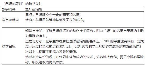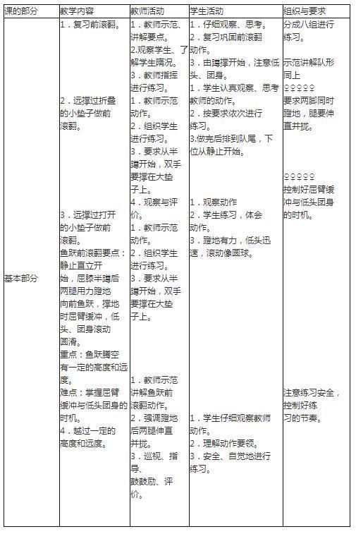 问题 阅读材料,设计一堂45分钟的课程,列举出基本部分的教学目标、教学方法和组织形式。 班级人数:初一学生,40人; 场地:操场; 器材:体操垫; 学习内容:鱼跃前滚翻。