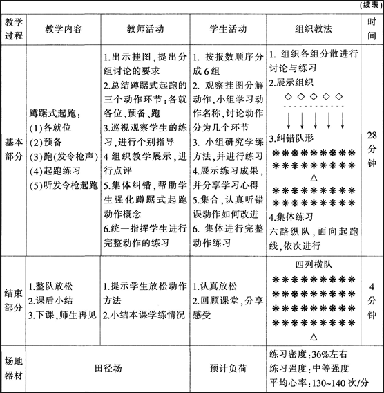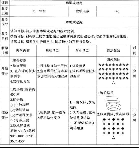 阅读材料.根据所提供的条件进行教学设计。 水平四,初中一年级(2)班,人数:40 教学内容:蹲踞式起跑。 教学条件.田径场。