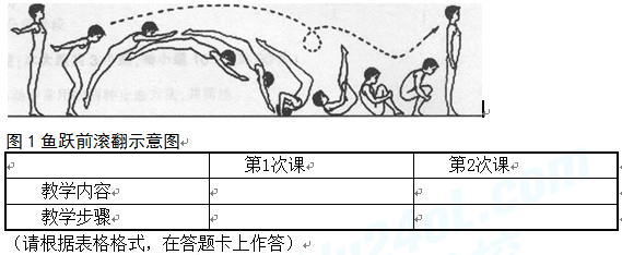 问题 初中阶段(水平四)体操学习内容为:“鱼跃前滚翻”(如图1),教学时数为4个学时,请依据提供的表格格式,设计出该教学单元的第1、2次课的教学内容和教学步骤。(20分)