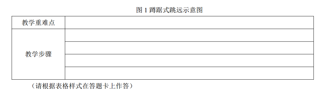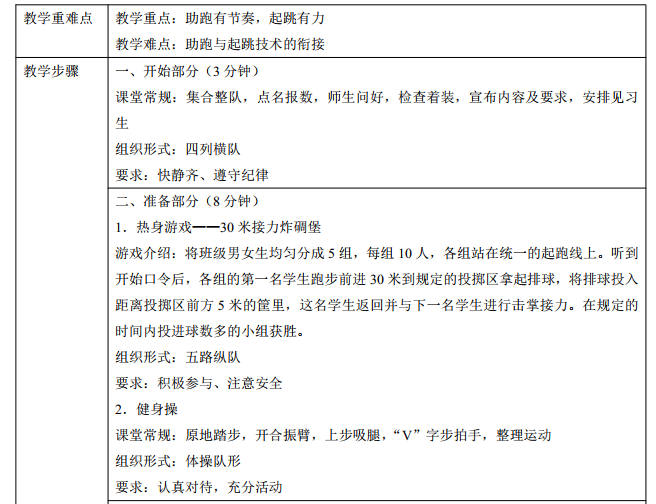 问题 某校初二(1) 班体育课, 男、 女生各 25 人, 教学内容为“蹲踞式跳远” 技术(如图 1)。 本单元共 4 个学时, 分 8 次课。 第 1 次课的内容为“腾空步”, 第 2 次课的内容为“助跑与起跳”。 要求: 依照提供的表格样式, 请设计出第 2 次课的教学重难点和基本部分的教学步骤(不少于 4步)。