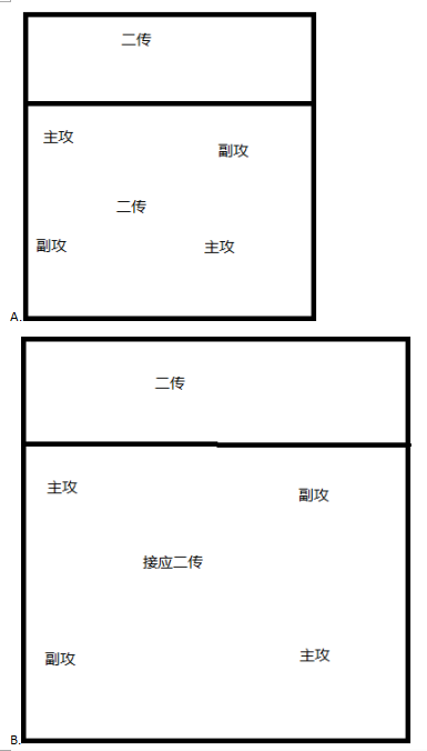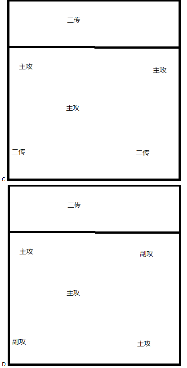 解析 本题考查的知识点为排球运动的“4-2”配备:安排4个进攻队员,2个二传队员;4个进攻队员又分为2个主攻、2个副攻队员;二传、主攻、副攻各成对站立。因此本题正确答案为A选项。