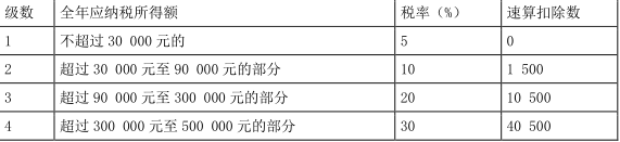 选项 A.(500 000-100 000-60 000-2 000×12-1 000×12)×30%-40 500=50 700 元 B.(500 000-200 000-60 000-2 000×12-1 000×12)×20%-10 500=30 300 元 C.(500 000-100 000-2 000×12-1 000×12)×30%-40 500=68 700 元 D.(500 000-100 000)×30%-40 500=79 500 元