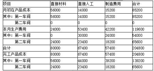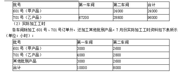 解析 (1)计算填列601号订单的产品成本计算单   一车间分配人工费用(按实际加工工时比例分配):   人工费用分配率=100000/10000=10   601号订单分配人工费用=10×3000=30000(元)   701号订单分配人工费用=10×4000=40000(元)   一车间分配制造费用(按实际加工工时比例分配):   制造费用分配率=80000/10000=8   601号订单分配制造费用=8×3000=24000(元)   701号订单分配制造费用=8×4000=32000(元)   二车间分配人工费用(按实际加工工时比例分配):   人工费用分配率=72000/8000=9   601号订单分配人工费=9×2600=23400(元)   701号订单分配人工费=9×2800=25200(元)   二车间分配制造费用(按实际加工工时比例分配):   制造费用分配率=56000/8000=7   601号订单分配制造费用=7×2600=18200(元)   701号订单分配制造费用=7×2800=19600(元)   产品成本计算单   批号:601(甲产品)         开工时间:2006年6月1日   批量:10台     完工数量:10台 完工时间:2006年7月20日 (2)计算填列701号订单的产品成本计算单   完工产品与在产品成本分配如下:   完工产品成本负担的第一车间材料费=67200/(3+5)×3=25200(元)   完工产品成本负担的第一车间人工费=40000/(3+5×40%)×3=24000(元)   完工产品成本负担的第一车间制造费用=32000/(3+5×40%)×3=19200(元)   由于第二车间无月末在产品,所以本月发生的各项生产费用合计全部计入本月完工产品成本。   产品成本计算单   批号:701(乙产品)         开工时间:2006年7月1日   批量:8台      完工数量:3台 完工时间:2006年 月 日