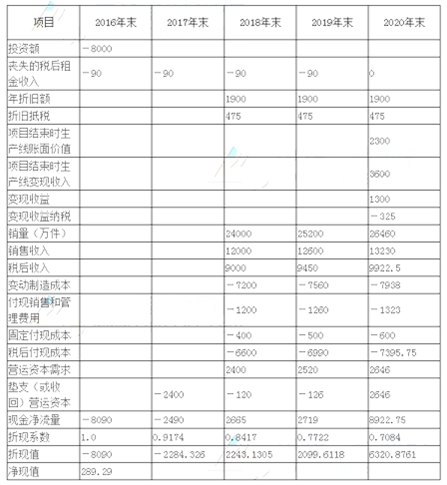 问题   甲公司是一家制造业上市公司,主营业务是包装箱的生产和销售。为进一步满足市场需求,公司准备新增一条智能化包装箱生产线。目前,正在进行该项目的可行性研究。   1.相关资料如下:   (1)该项目如果可行,拟在2016年12月31曰开始投资建设生产线,预计建设期1年,即项目将在2017年12月31日建设完成,2018年1月1日投产使用,该生产线预计购置成本8000万元,项目预期持续3年。按税法规定,该生产线折旧年限4年,残值率5%,按直线法计提折旧,预计2020年12月31曰项目结束时该生产线变现价值元。   (2)公司一闲置厂房拟对外出租,每年租金120万元,在出租年度的上年年末收取。该厂房可用于安装该生产线,安装期间及投产后,该厂房均无法对外出租。   (3)该项目预计2018年生产并销售24000万件,产销量以后每年按5%僧长。预计包装箱单位售价0.5元,单位变动制造成本0.3元;每年付现销售和管理费用占销售收入的10%; 2018 年、2019年、2020年每年固定付现成本分别为400万元、500万元、600万元。   (4)该项目预计营运资本占销售收入的20%,垫支的营运资本在运营年度的上年年末投入,在项目结束时全部收回。   (5)为筹集所需资金,该项目拟通过发行债券和留存收益进行筹资。发行期限5年、面值100元、票面利率8%的债券,每年末付息一次,发行价格1050元,发行费用率为发行价格的2%;公司普通股卩系数1.75,无风险报酬率3.85%,市场组合必要报酬率8.85%,当前公司资本结构(负债/权益)为1/1;目标资本结构(负债/权益)为2/3。   (6)公司所得税税率为25%。   假设该项目的初始现金发生在2016年末,营业现金流量均发生在投产后各年末。   要求:(1)计算债务税后资本成本、股权资本成本和项目加权平均资本成本。   (2)计算项目2016年及以后各年年末的现金净流量及项目的净现值,并判断该项目是否可行。(计算过程和结果填入下方表格中)。  (3)假设其他条件不变,利用最大最小法,计算生产线可接受的最高购罝价格。