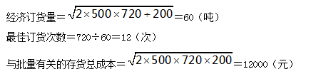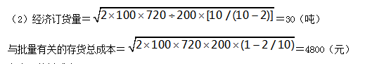 解析 (1)购置成本=年需求量×(单价+单位运费)   =720×(3000+100)=2232000(元) 不设置保险储备时:   缺货成本=(2×30%+4×20%)×12×50=840(元)   保险储备成本=0   缺货成本+保险储备成本=840(元)   设置2吨的保险储备时:   缺货成本=2×20%×12×50=240(元)   保险储备成本=2×200=400(元)   缺货成本+保险储备成本=240+400=640(元)   设置4吨的保险储备时:   缺货成本=0   保险储备成本=4×200=800(元)   缺货成本+保险储备成本=800(元)   经比较,设置2吨保险储备时的缺货成本与保险储备成本之和最低,应设置2吨的保险储备。   方案一的总成本=2232000+12000+640=2244640(元) 方案二的总成本=720×(3300+20)+4800=2395200(元)   (3)方案一的总成本低于方案二的总成本,应当选择方案一。