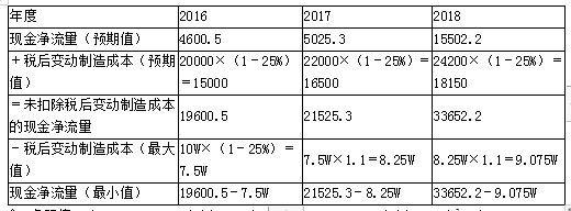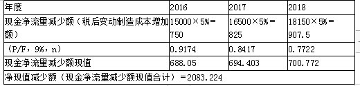 解析 (1)单位变动制造成本的最大值   假设单位变动制造成本的最大值为W元,则2016年~2018年各年的现金净流量估算如下(单位:万元): 令:净现值=(19600.5-7.5W)/(1+9%)+(21525.3-8.25W)/(1+9%)2+(33652.2-9.075W)/(1+9%)3-17520=0   可得:W=2139.26(元)   即单位变动制造成本的最大值为2139.26元。   (2)净现值对单位变动制造成本的敏感系数   假定单位变动制造成本上升5%,其他条件不变,则净现值的减少额为:(单位:万元) 净现值对单位变动制造成本的敏感系数=(-2083.224/2901.09)/5%=-14.36