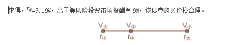解析 (1)平均信用风险补偿率=(X公司信用风险补偿率+Y公司信用风险补偿率+Z公司信用风险补偿率)/3=[(7.5%-4.5%)+(7.9%-5%)+(8.3%-5.2%)]/3=3% 2017年1月10日到期的政府债券与甲公司债券到期日相近,则无风险利率=5%,税前债务资本成本=5%+3%=8%。 公司采用风险调整法估计拟发行债券的税前债务资本成本,并以此确定该债券的票面利率,则票面利率为8% (2)1000×8%×(P/A,10%,5)+1000/1.15=924.16(元) (3)设到期收益率为rd,则 P=1000×8%×(P/A,rd ,3)+1000/(1+rd)3=970 当rd=9%,P=974.70;当rd=10%,P=950.25 使用内插法: