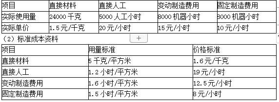 解析 (1)直接材料价格差异=24000×(1.5-1.6)=-2400(元)   直接材料数量差异=(24000-5000×5)×1.6=-1600(元)   直接材料成本差异=-2400-1600=-4000(元)   (2)直接人工的工资率差异=5000×(20-19)=5000(元)   直接人工的人工效率差异=(5000-5000×1.2)×19= -19000(元)   直接人工成本差异=5000-19000=-14000(元)   (3)变动制造费用的耗费差异=8000×(15-12.5)=20000(元)   变动制造费用的效率差异=12.5×(8000-5000×1.6)=0(元)   变动制造费用的成本差异=20000(元)   (4)固定制造费用的耗费差异=8000×10-6000× 1.5×8=8000(元)   固定制造费用的闲置能量差异=(6000×1.5-8000)×8=8000(元)   固定制造费用的效率差异=(8000-5000×1.5)×8= 4000(元)   固定制造费用的成本差异=8000+8000+4000=20000(元)   (5)产品成本差异总额=-4000-14000+20000+20000=22000(元)   单位成本差异=22000/5000=4.4(元/平方米)