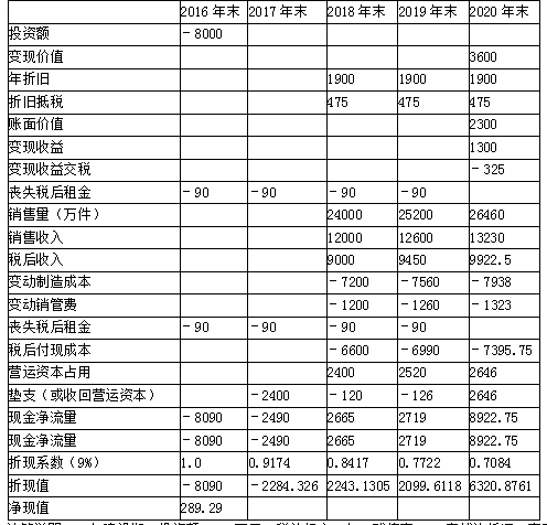 问题 (2016年)甲公司是一家制造业上市公司,主营业务是包装箱的生产和销售。为进一步满足市场需求,公司准备新增一条智能化包装箱生产线。目前,正在进行该项目的可行性研究,资料如下。 1.该项目如果可行,拟在2016年12月31日开始投资建设生产线,预计建设期1年,即项目将在2017年12月31日建设完成,2018年1月1日投产使用,该生产线预计购置成本8000万元,项目预期持续3年。按税法规定,该生产线折旧年限4年,残值率5%,按直线法计提折旧,预计2020年12月31日项目结束时该生产线变现价值3600万元。 2.公司以闲置厂房拟对外出租,每年租金120万元,在出租年度的上年年末收取。该厂房可用于安装该生产线,安装期间及投产后,该厂房均无法对外出租。 3.该项目预计2018年生产并销售24000万件,产销量以后每年按5%增长。预计包装箱单位售价0.5元,单位变动制造成本0.3元;每年付现销售和管理费用占销售收入的10%;2018年、2019年、2020年每年固定付现成本分别为400万元、500万元、600万元。 4.该项目预计营运资本占销售收入的20%,垫支的营运资本在运营年度的上年年末投入,在项目结束时全部收回。 5.公司所得税税率为25%,项目资本成本9%。 假设该项目的初始现金发生在2016年末,营业现金流量均发生在投产后各年末。 要求:计算项目2016年及以后各年年末的现金净流量及项目的净现值,并判断该项目是否可行。(计算过程和结果填入下方表格中)。 单位:万元