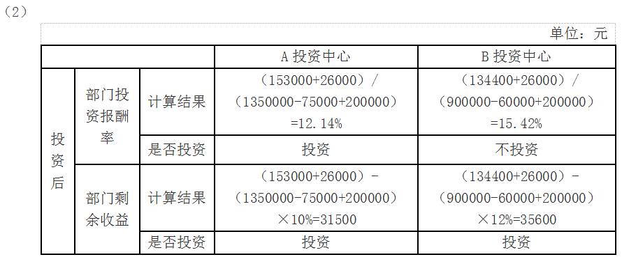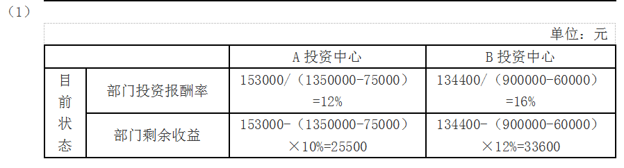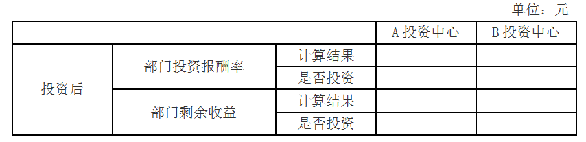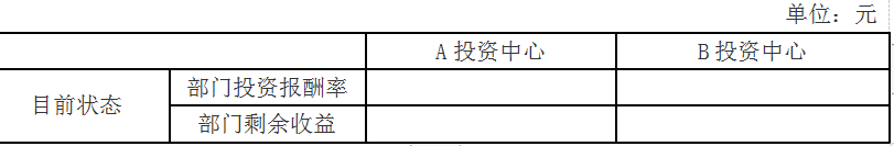 问题 (2017年)甲公司是一家上市公司,正对内部A、B投资中心进行业绩考核。2016年相关资料如下: 要求: (1)分别计算A、B两个投资中心的部门投资报酬率和部门剩余收益(结果填入下方表格中,不用列出计算过程)。 (2)假定公司现有一投资机会,投资额20万元,每年可创造税前经营利润26000元,如果A、B投资中心都可进行该投资,且投资前后各自要求的税前投资报酬率保持不变,计算A、B投资中心分别投资后的部门投资报酬率和部门剩余收益;分析如果公司分别采用投资报酬率和剩余收益对A、B投资中心进行业绩考核,A、B投资中心是否愿意进行该投资(结果填入下方表格中,不用列出计算过程)。 (3)综合上述计算,分析部门投资报酬率和部门剩余收益作为投资中心业绩评价指标的优缺点。