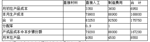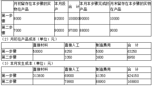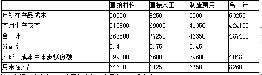 解析 (1) 第一步骤成本计算单   2017年9月 单位:元 第一车间月末留存在本步骤的实物在产品的完工程度为60%   直接材料分配率=363800/(88000+10000+9000)=3.4(元/千克)   直接人工分配率=77250/(10000×60%+9000+88000)=0.75(元/千克)   制造费用分配率=46350/(10000×60%+9000+88000)=0.45(元/千克)   第二步骤成本计算单   2017年9月 单位:元 第二车间月末留存在本步骤的实物在产品的完工程度为50%,   直接人工分配率=83250/(88000+9000×50%)=0.9(元/千克)   制造费用分配率=92500/(88000+9000×50%)=1(元/千克)   产品成本汇总计算单   2017年9月 单位:元 (2)A产品产量=88000×6/(6+5)=48000(千克)   B产品产量=88000×5/(6+5)=40000(千克)   A产品可变现净值=48000×8.58=411840(元)   B产品可变现净值=40000×(7.2-0.336)=274560(元)   A产品分配的成本=572000×411840/(411840+274560)=343200(元)   B产品分配的成本=572000×274560/(411840+274560)=228800(元)   A产品单位成本=343200/48000=7.15(元/千克)   B产品单位成本=228800/40000+0.336=6.06(元/千克)