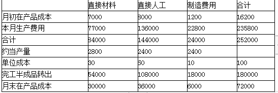 解析 (1)第一车间成本计算单   产品名称:半成品   单位:元 (2)半成品发出的加权平均单位成本=(400×127.5+180000)÷(400+1800)=105(元)   (3)作业成本分配表 单位:元 (4)汇总成本计算单 单位:元