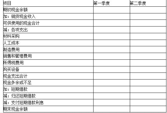 问题 (2018年)甲公司是一家制造企业,正在编制2019年第一、二季度现金预算,年初现金余额52万元。   相关资料如下:   (1)预计第一季度销量30万件,单位售价100元;第二季度销量40万件,单位售价90元;第三季度销量50万件,单位售价85元,每季度销售收入60%当季收现,40%下季收现,2019年初应收账款余额800万元,第一季度收回。   (2)2019年初产成品存货3万件,每季末产成品存货为下季销量的10%。   (3)单位产品材料消耗量10千克,单价4元/千克,当季所购材料当季全部耗用,季初季末无材料存货,每季度材料采购货款50%当季付现,50%下季付现。2019年初应付账款余额420万元,第一季度偿付。   (4)单位产品人工工时2小时,人工成本10元/小时;制造费用按人工工时分配,分配率7.5元/小时。销售和管理费用全年400万元,每季度100万元。假设人工成本、制造费用、销售和管理费用全部当季付现。全年所得税费用100万元,每季度预缴25万元。   (5)公司计划在上半年安装一条生产线,第一、二季度分别支付设备购置450万元、250万元。 (6)每季末现金余额不能低于50万元。低于50万元时,向银行借入短期借款,借款金额为10万元的整数倍。借款季初取得,每季末支付当季利息,季度利率2%。高于50万元时,高出部分按10万元的整数倍偿还借款,季末偿还。   第一、二季度无其他融资和投资计划。   要求:根据上述资料,编制公司2019年第一、二季度现金预算(结果填入下方表格中,不用列出计算过程)。   现金预算 单位:万元