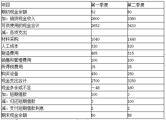 解析 现金预算 单位:万元 计算说明:   (1)第一季度销货现金收入=30×100×60%+800=2600(万元),第二季度销货现金收入=30×100×40%+40×90×60%=3360(万元)   (2)预计生产量=预计销售量+预计期末产成品数量-预计期初产成品数量,第一季度初产成品存货为3万件,第一季度末产成品存货为40×10%=4(万件),第二季度末产成品存货为50×10%=5(万件),第一季度销量30万件,第二季度销量40万件。所以,第一季度预计生产量=30+4-3=31(万件),第二季度预计生产量=40+5-4=41(万件)。   第一季度采购现金支出=31×10×4×50%+420=1040(万元),第二季度采购现金支出=31×10×4×50%+41×10×4×50%=1440(万元)。   (3)第一季度人工成本支出=31×2×10=620(万元),第二季度人工成本支出=41×2×10=820(万元)   (4)第一季度制造费用支出=31×2×7.5=465(万元),第二季度制造费用支出=41×2×7.5=615(万元)   (5)设第一季度短期借款A万元:   则:-48+A-A×2%≥50,解得:A≥100,借款金额为10万元的整数倍,所以借款100万元。第一季度支付利息=100×2%=2(万元)   设第二季度归还短期借款B万元:   则:160-B-2≥50,解得:B≤108,由于按10万元的整数倍偿还借款,所以归还短期借款100万元。