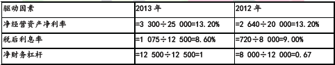 【本题知识点已不在2017 年考试大纲范围】甲公司是一家化工原料生产企业,生产经营无季节性。股东使用管理用财务报表分析体系对公司2013 年度业绩进行评价...