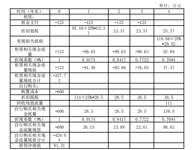 解析 (1)β资产=1.75÷[1+(1-25%)×(1/1)]=1 该项目的β权益=1×[1+(1-25%)×(2/3)]=1.5 权益资本成本=无风险报酬率+β权益×风险溢价=5%+1.5×7%=15.5% 项目资本成本=加权平均资本成本=12%×(1-25%)×40%+15.5%×60%=13% (2)初始营运资本投资=5×200×16%=160(万元) 税后培训费=8×(1-25%)=6(万元) 年折旧额=600×(1-5%)/5=114(万元) 第四年末账面净值=600-4×114=144(万元) 第四年末回收残值现金流量=100+(144-100)×25%=111(万元) 0时点的现金净流量=-600-160-6=-766(万元) 1~3年的现金净流量=5×200×(1-25%)-(4.1×200+8)×(1-25%)+114×25%=157.5(万元) 第4年的现金净流量=157.5+111+160=428.5(万元) 净现值=-766+157.5×(P/A,13%,3)+428.5×(P/F,13%,4)=-131.31(万元) 由于自行购置方案的净现值小于0,所以自行购置方案扩充生产能力不可行。 (3)该合同不属于选择简化处理的短期租赁和低价值资产租赁,符合融资租赁的认定标准。折现率=12%×(1-25%)=9% 融资租赁取得设备折旧=123×4×(1-5%)/5=93.48(万元) 第4年年末账面净值=123×4-93.48×4=118.08(万元) (4)租赁相比较自行购置是合算的,但利用租赁设备扩充生产能力的调整净现值=-131.31+91.31=-40(万元),所以利用租赁设备来扩充生产能力也是不可行的。 (5)设销量比目前预计增加Q万件: 则每年增加的营业现金流量=(5-4.1)Q×(1-25%)=0.675Q 初始增加的营运资本流量=-5×Q×16%=-0.8Q 项目终结收回的增加营运资本=0.8Q -0.8Q+0.675Q×2.9745+0.8Q×0.6133=131.31 Q=77.31(万件) 所以销量达到400+77.31=477.31(万件)。
