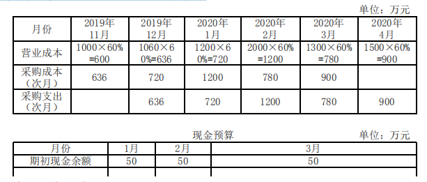 问题 A公司2019年12月31日的资产负债表如下: 公司收到大量订单并预计从银行取得借款。一般情况下,公司每月应收账款周转率(按期末时点数计算)保持不变。当月形成的应收账款次月收回。公司在销售的前一个月购买存货,购买金额等于次月销售成本,并于购买的次月付款。预计2020年1至3月的工资费用分别为150万元、200万元和150万元。预计1至3月的其他付现费用分别为452万元、240万元和610万元,该公司为商业企业,其营业成本率为60%。 2019年11至12月的实际销售额和2020年1至4月的预计销售额如下表: 要求: (1)若公司最佳现金余额为50万元,现金不足向银行取得短期借款,现金多余时归还银行借款,借款年利率为10%,借款在期初,还款在期末,借款、还款均为1万元的整数倍,所有借款的应计利息均在每季度末支付,要求编制2020年1至3月的现金预算。 (2)2020年3月末预计应收账款、存货和应付账款为多少?
