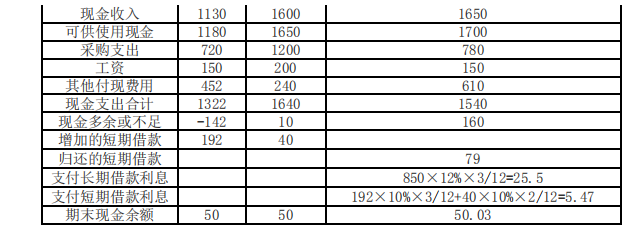 解析 (1)因为应收账款周转率不变,12月的应收账款周转率=1060/530=2(次) 则:预计1月末的应收账款=1200/2=600(万元) 预计2月末的应收账款=2000/2=1000(万元) 预计3月末的应收账款=1300/2=650(万元) 所以:预计1月收现的现金收入=530+1200-600=1130(万元) 预计2月收现的现金收入=600+2000-1000=1600(万元) 预计3月收现的现金收入=1000+1300-650=1650(万元) (2)通过第(1)问计算可知,3月末应收账款=1300/2=650(万元) 3月末存货=1500×60%=900(万元) 3月末应付账款=900(万元)。