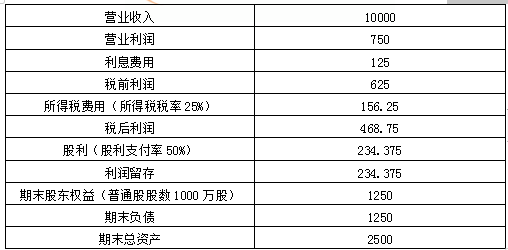 解析 (1)2019年可持续增长率计算: 营业净利率=468.75/10000=4.69% 总资产周转率=营业收入/总资产=10000/2500=4(次) 权益乘数=总资产/股东权益=2500/1250=2 利润留存率=234.375/468.75=50% 可持续增长率=(营业净利率×总资产周转率×期末总资产权益乘数×利润留存率)/(1-营业净利率×总资产周转率×期末总资产权益乘数×利润留存率)=(4.69%×4×2×50%)/(1-4.69%×4×2×50%)=23.09% (2)①设营业净利率为x,则: 35%=(x×50%×2×4)/(1-x×50%×2×4) 求得:x=6.48%。 ②预计营业收入=10000×(1+35%)=13500(万元) 总资产=营业收入/总资产周转率=13500/4=3375(万元) 期末股东权益=总资产/权益乘数=3375/2=1687.5(万元) 期初股东权益=1250(万元) 本期利润留存=预计营业收入×营业净利率×利润留存率=13500×4.69%×50%=316.58(万元) 需要筹集外部权益资本=期末股东权益-期初股东权益-本期利润留存=1687.5-1250-316.58=120.92(万元)。