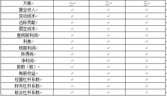 问题 A公司是一个生产和销售通讯器材的股份公司。该公司适用的所得税税率为25%。公司的资本结构为:400万元负债(利息率5%),普通股20万股。对于明年的预算有三种方案: 方案一:维持目前的经营决策和财务政策。预计销售45000件,售价为240元/件,单位变动成本为200元/件,固定成本为120万元。 方案二:更新设备并用负债筹资。预计更新设备需投资600万元,生产和销售量不会变化,但单位变动成本将降低至180元/件,固定成本将增加至150万元。借款筹资600万元,预计新增借款的利率为6.25%。 方案三:更新设备并用股权筹资。更新设备的情况与第二方案相同,不同的只是用发行新的普通股筹资。预计新股发行价为每股30元,需要发行20万股,以筹集600万元资金。 要求: (1)计算三个方案下的每股收益、经营杠杆系数、财务杠杆系数和联合杠杆系数(请将联合杠杆系数结果填入下列表格中,不必列示计算过程); 金额单位:元 (2)计算方案二和方案三每股收益相等的销售量; (3)计算三个方案下,每股收益为零的销售量; (4)根据上述结果分析:哪个方案的总风险最大?哪个方案的报酬最高?如果公司销售量下降至30000件,方案二和方案三哪一个更好些?请分别说明理由。