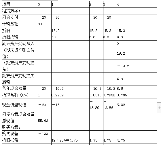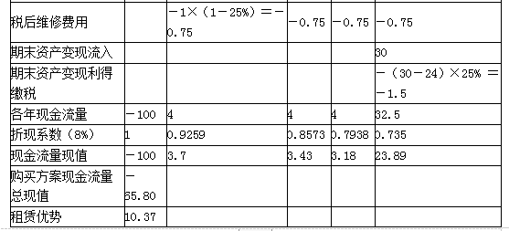 解析  有关项目说明如下:   (1)租赁方案   ①判断租赁的税务性质。该合同不属于选择简化处理的短期租赁和低价值资产租赁,符合融资租赁的认定标准,租赁费用每年20万元,不可在税前扣除。   ②租赁资产的计税基础。由于合同约定了承租人的付款总额,租赁费是取得租赁资产的成本,全部构成其计税基础:   租赁资产的计税基础=20×4=80(万元)   ③折旧抵税。按同类固定资产的折旧年限计提折旧费:   租赁资产的年折旧额=80×(1-5%)/5=15.2(万元)   每年折旧抵税=15.2×25%=3.8(万元)   ④期末资产变现。该设备租赁期届满时租赁资产所有权不转让:   期末资产变现流入=0(万元)   期末资产账面价值=80-15.2×4=19.2(万元)   期末资产变现损失=19.2-0=19.2(万元)   期末资产变现损失减税=19.2×25%=4.8(万元)   ⑤各年现金流量。   第1年年初(第0年年末)现金流量=-20(万元)   第1年至第3年年末现金流量=-20+3.8=-16.20(万元)   第4年年末现金流量=3.8+4.8=8.6(万元)   ⑥租赁方案现金流量总现值=-20-16.20×2.5771+8.60×0.7350=-55.43(万元)   (2)购买方案   ①购置设备。   第1年年初购置设备=100(万元)   ②折旧抵税。按税法规定计提折旧费:   购买资产的年折旧额=100×(1-5%)/5=19(万元)   每年折旧抵税=19×25%=4.75(万元)   ③税后维修费用。   每年年末税后维修费用=1×(1-25%)=0.75(万元)   ④期末资产变现。   期末资产变现流入=30(万元)   期末资产账面价值=100-19×4=24(万元)   期末资产变现利得=30-24=6(万元)   期末资产变现利得缴税=6×25%=1.5(万元)   ⑤各年现金流量。   第1年年初(第0年年末)现金流量=-100(万元)   第1年至第3年年末现金流量=4.75-0.75=4(万元)   第4年年末现金流量=4.75-0.75+30-1.5=32.5(万元)   ⑥购买方案现金流量总现值=-100+4×2.5771+32.5×0.7350=-65.80(万元)   (3)租赁方案相对购买方案的净现值 租赁方案相对购买方案的净现值=-55.43-(-65.80)=10.37(万元)   本例中,采用租赁方案更有利。