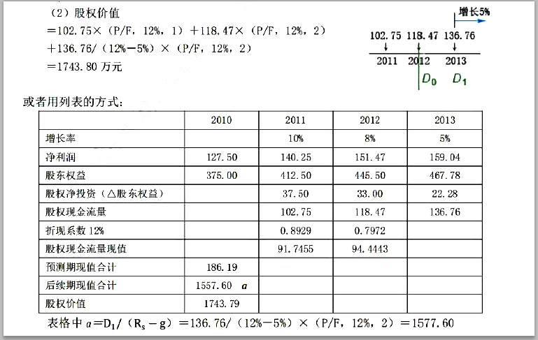 解析 (1)2010 年净经营资产=经营营运资本+净经营长期资产 =营业收入/经营营运资本周转次数+营业收入/净经营长期资产周转次数 =1000/4+1000/2=750 万元 2010 年税后经营净利润=净经营资产×净经营资产净利率=750×20%=150 万元 2010 年税后利息费用=(750/2)×6%=22.5 万元 2010 年净利润=150-22.5=127.5 万元 2011 年股权现金流量=税后净利润-△股权净投资 =127.5×(1+10%)-(750/2)×10%=102.75 万元 2012 年股权现金流量=税后净利润-△股权净投资 =127.5×(1+10%)×(1+8%)-(750/2)×(1+10%)×8%=118.47 万元 2013 年股权现金流量=税后净利润-△股权净投资 =127.5×(1+10%)×(1+8%)×(1+5%)-(750/2)×(1+10%)×(1+8%) ×5%=136.76 万元
