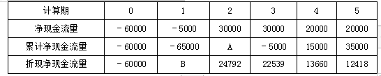 解析  (1)①静态回收期=3+5000/20000=3.25(年)   ②A=-65000+30000=-35000(元)   B=-5000×(P/F,10%,1)=-5000×0.9091=-4545.5(元)   ③动态回收期=4+3554.5/12418=4.29(年)   ④净现值=-60000-4545.5+24792+22539+13660+12418=8863.5(元)   (2)对于甲方案和丙方案,由于净现值大于0,所以可行;   对于乙方案,由于项目的资本成本10%大于内含报酬率8%,所以不可行。   (3)甲方案净现值的等额年金=8863.5/(P/A,10%,5)=8863.5/3.7908=2338.16(元)   丙方案净现值的等额年金=16000/(P/A,10%,10)=16000/6.1446=2603.91(元)   由此可知,丙方案最优。   (4)计算期的最小公倍数为10,甲方案需要重置一次。   甲方案调整后的净现值=8863.5+8863.5×(P/F,10%,5)=8863.5+8863.5×0.6209=14366.85(元)   丙方案的净现值16000元不需要调整,由此可知,丙方案最优。
