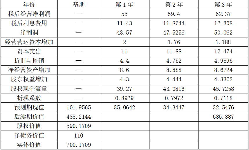解析 单位:万元 每股价值=590.1709/100=5.9(元),高于当前每股市价5元,所以该股票被市场低估了。 【解析】基期净经营资产=110×2=220(万元),第1年净经营资产=220+8.6=228.6(万元),第1年净负债=228.6÷2=114.3(万元),第1年税后利息费用=114.3×10%=11.43(万元),第2年税后利息费用=(228.6+8.888)÷2×10%=11.8744(万元),第3年税后利息费用=(228.6+8.888+8.6742)÷2×10%=12.308(万元)。