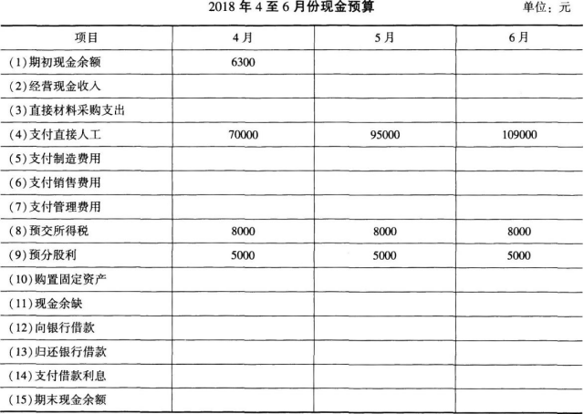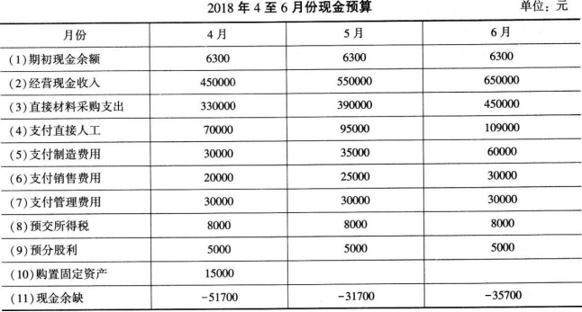 问题 E企业2018年有关预算资料如下: (1)该企业2至7月份的销售收入分别为300 000元、400 000元、500 000元、600 000元、700 000元和800 000元。 每月的销售收入中,当月收到现金60%,下月收到现金30%,下下月收到现金10%。 (2)各月直接材料采购金额按下一个月销售收入的60%计算。所购材料款于当月支付现金50%,下月支付现金50%。 (3)该企业4至6月份的制造费用分别为40 000元、45 000元和70 000元,其中包括非付现费用每月10 000元。 4~6月份的销售费用分别为25 000元、30 000元和35 000元,每月的非付现销售费用均为5 000元。 4~6月份的管理费用均为50 000元,其中非付现费用每月为20 000元。 (4)该企业4月份购置固定资产,需要现金15000元。 (5)该企业在现金不足时,向银行借款(借款为1000元的倍数); 在现金有多余时,归还银行借款(还款也为1000元的倍数)。 借款在期初,还款在期末,借款年利率为12%,每季末支付利息。 (6)该企业月末现金余额范围为6000至7000元。 要求: 编制2018年4至6月份现金预算(见下表,为简化计算,本题不考虑增值税)。